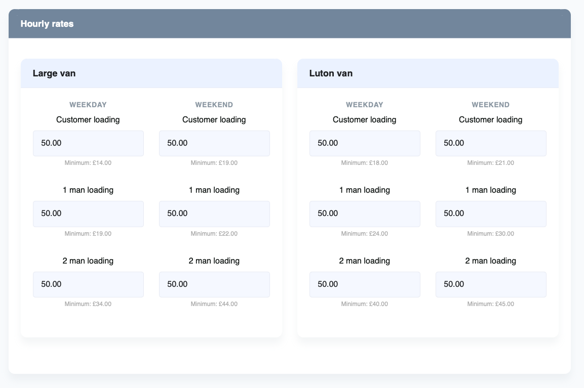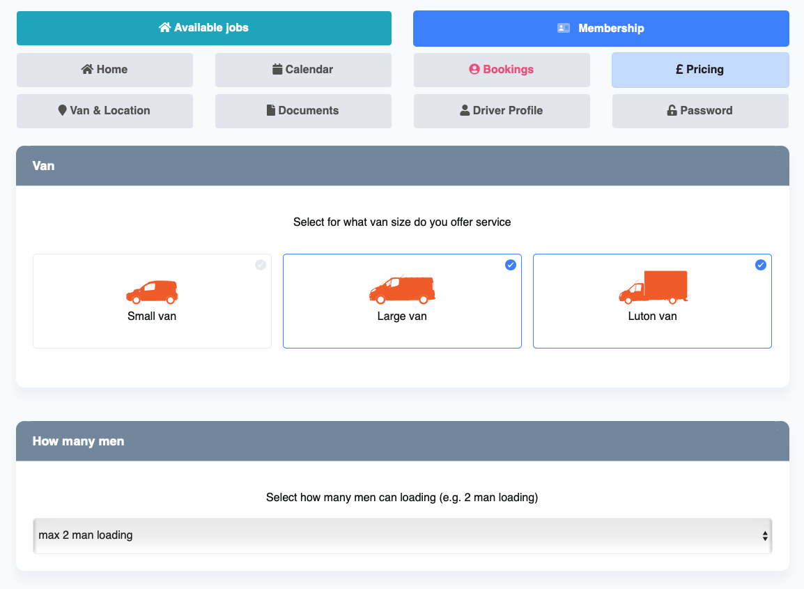 Select your applicable van sizes and select if you have any helpers. You must select at least one type of van and set your prices, all fields are required.