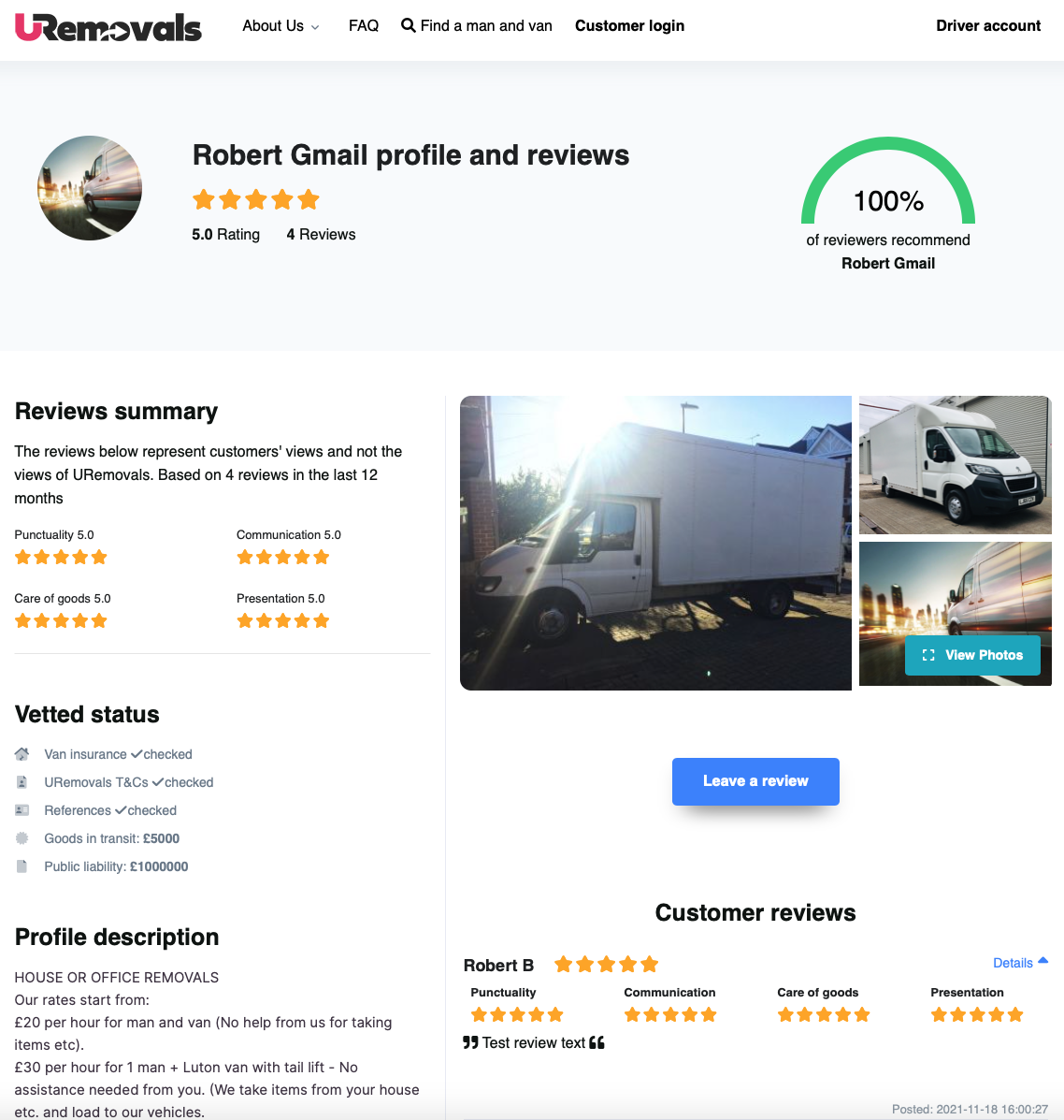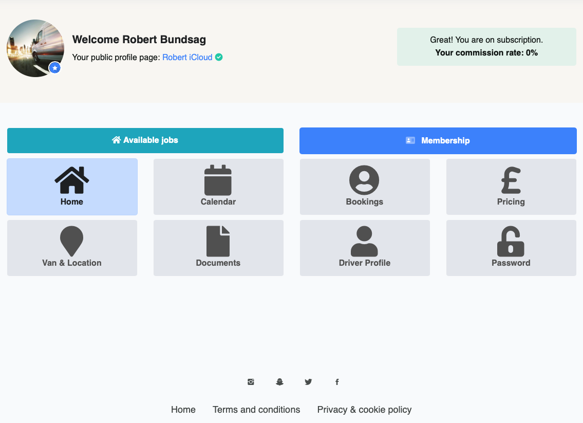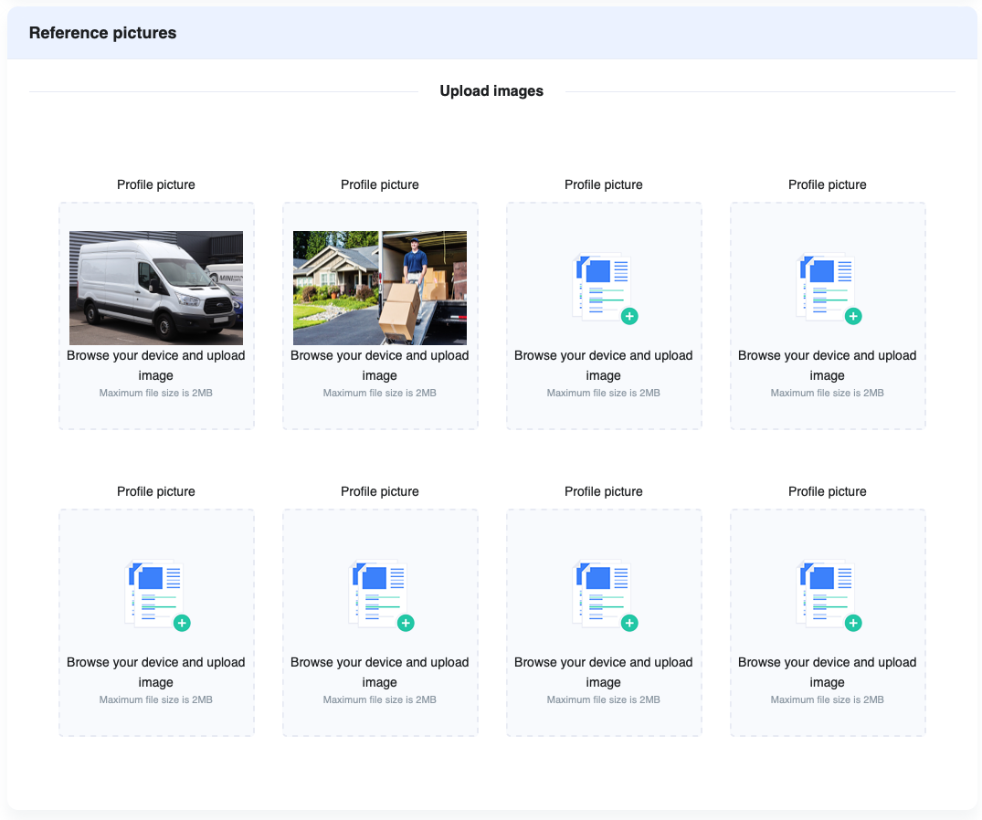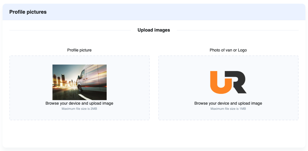 Upload your profile picture and a photo of your van or company logo. Both are mandatory. (Will be visible on your profile page)