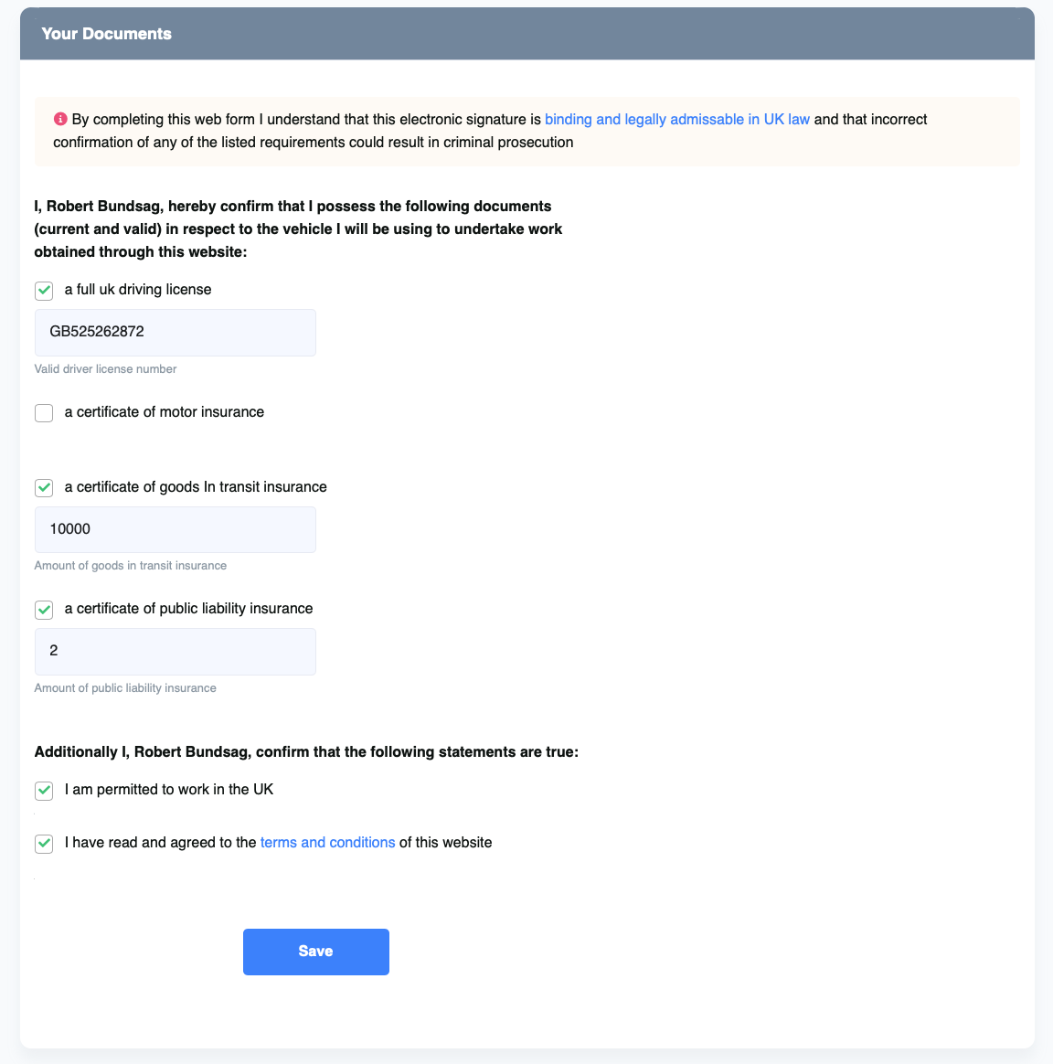 - Certificate of van insurance (for hire and reward) you need to upload a copy. We will check and set up the expiry date.