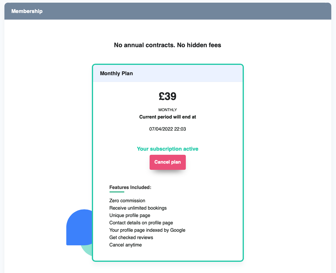 After successful payment, you will see on your dashboard, that your 0% commission is active. As well as on your membership page you will see the date of the next billing cycle, and a cancel button if you would like to cancel your subscription. If you cancel a subscription you can resume until the end of your billing period.