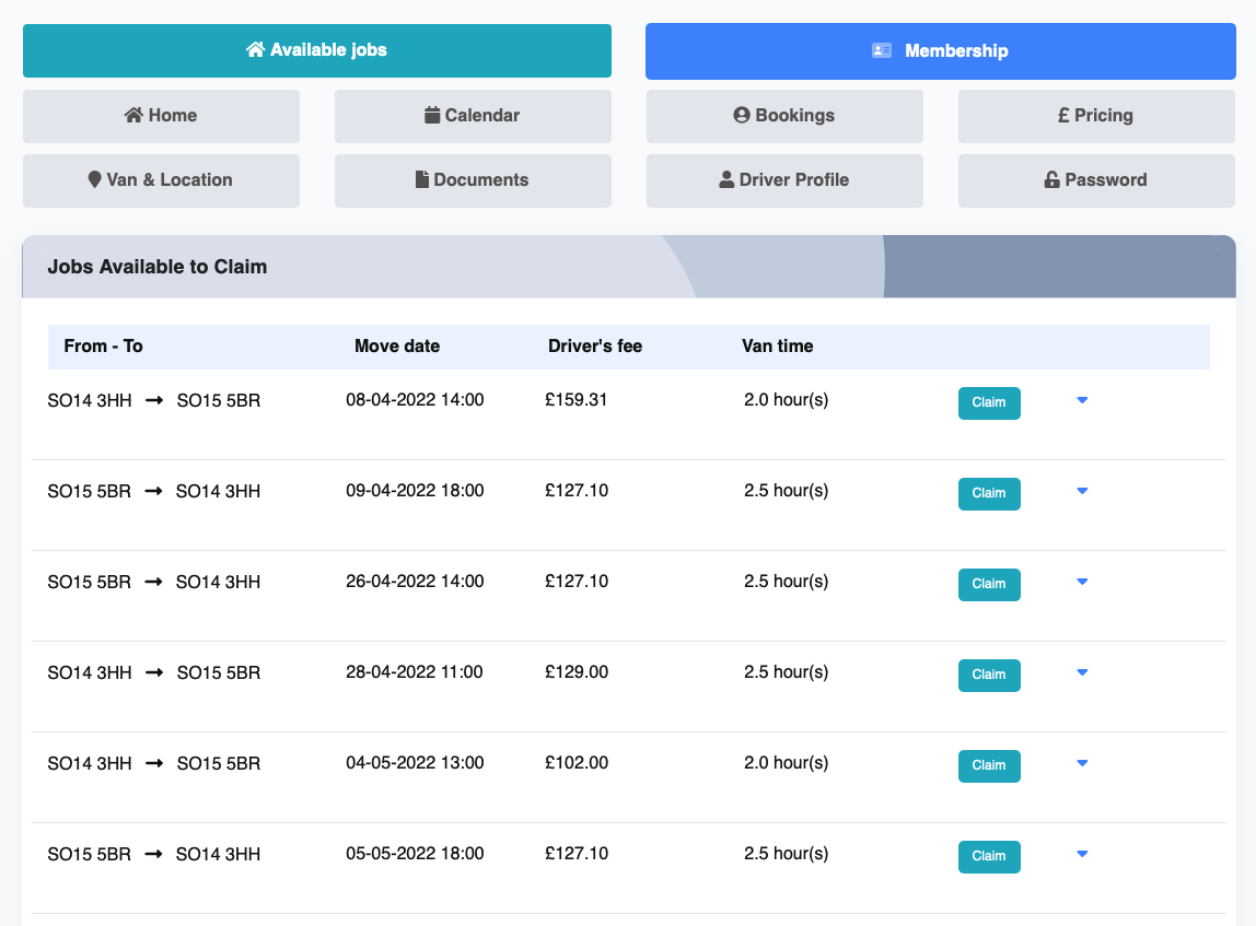In this section, you can see available jobs that you can Claim if it does fit your availability or if you have an empty route in that area. Here you can also check the booking details simply click the small triangle. These jobs appear here for example when another service provider rejected the booking.