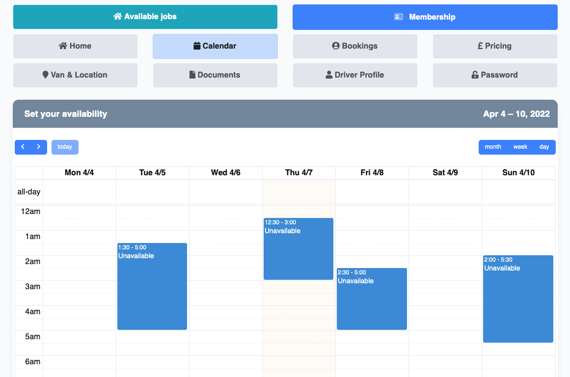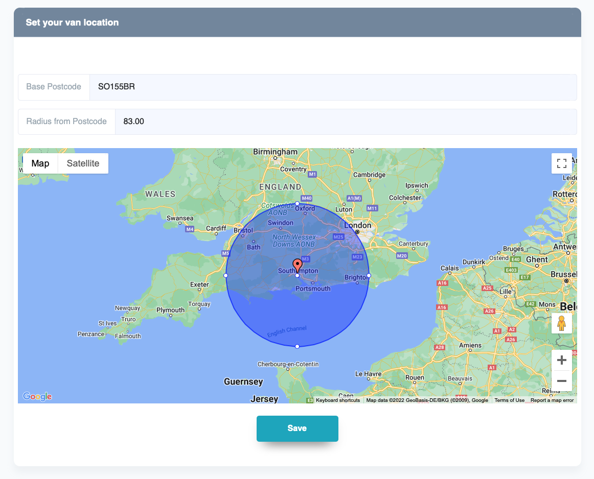 You can set up the postcode of your base (van location) and the radius from where would like to get bookings. A valid postcode is necessary. An invalid postcode will throw an error message.