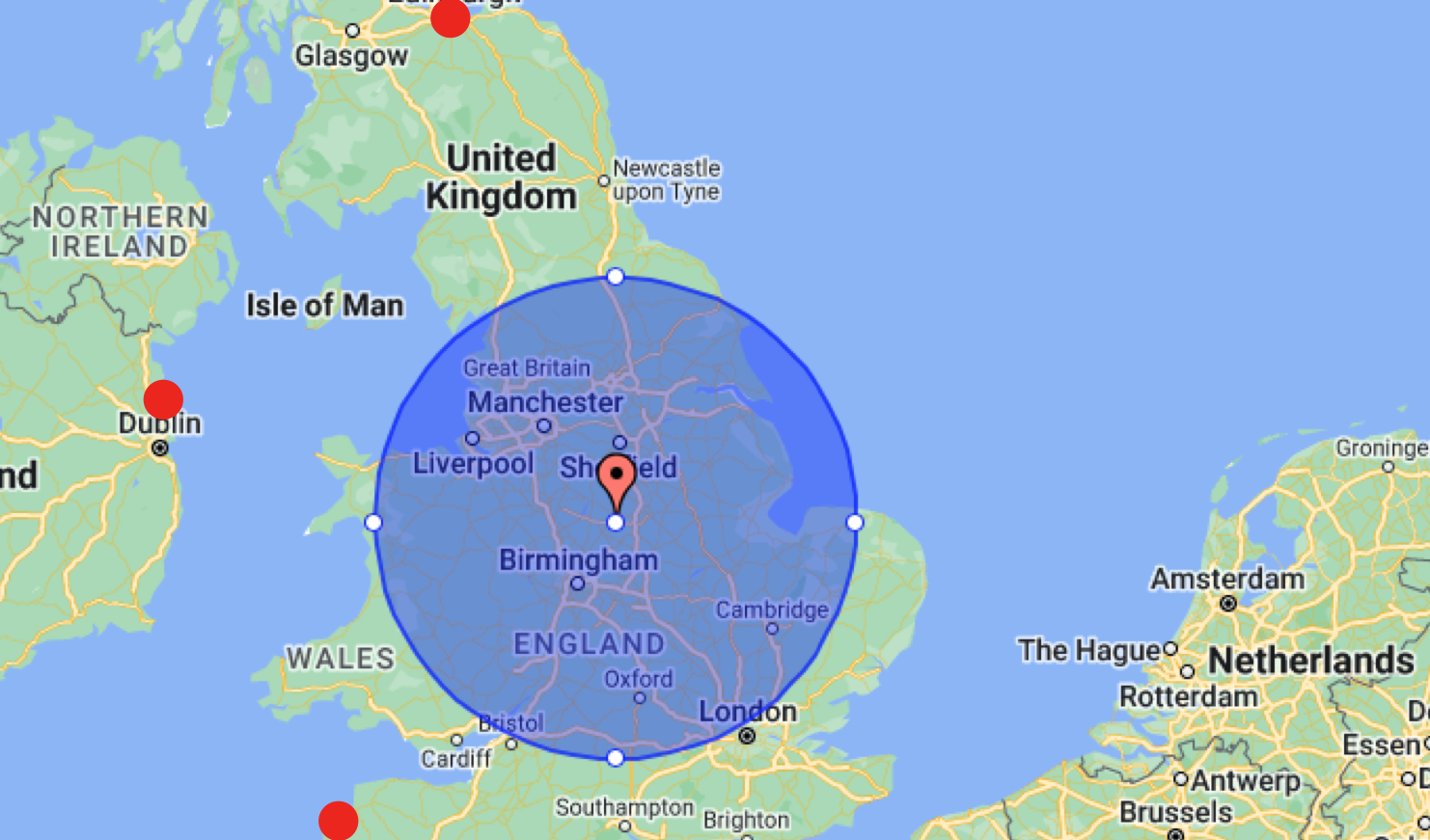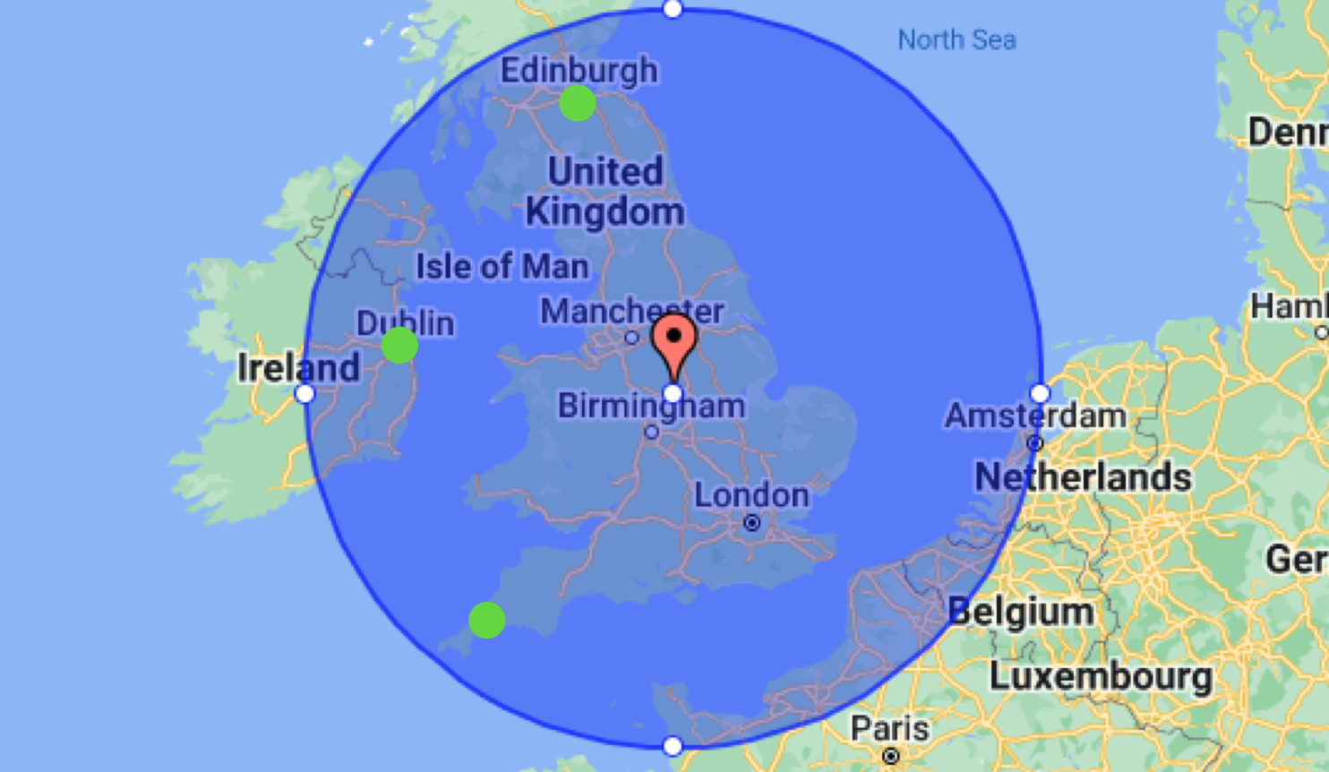 If you base in Derby and set up for a radius of 300 miles, you may receive bookings from Dublin, Cornwall, and Edinburgh. In the second case, you do not receive a booking from the mentioned areas above.