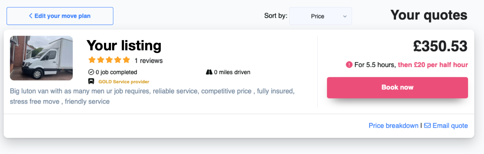 Your listing is only displayed in the quote list if available on the booked date and time and if the collection or drop-off address is inside your setup radius.